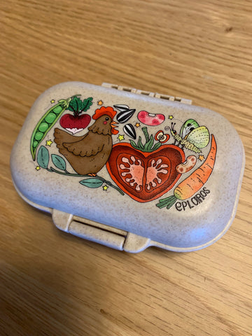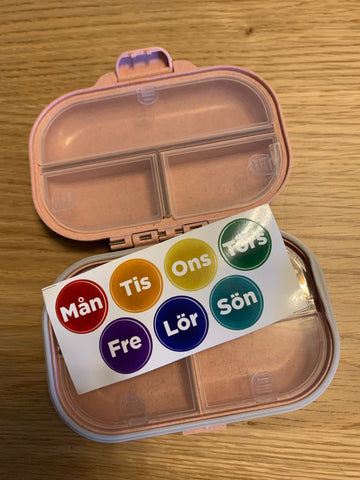 Límmiðablað með sjö límmiðum með nöfnum (á sænsku) fyrir mismunandi daga fylgir með, sem þú getur notað ef þú vilt nota kassann sem daglegan pillukassa.